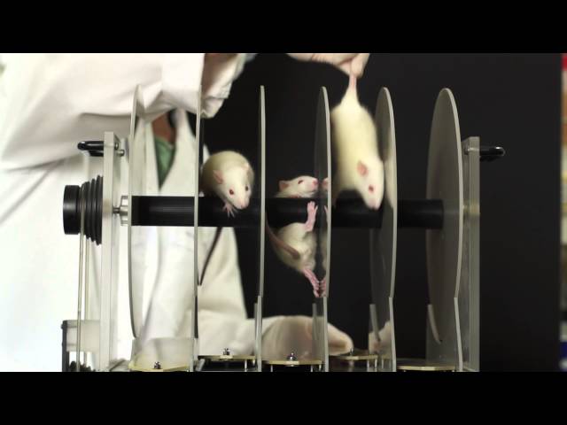 滾輪跑步機實驗可應用於腦部或神經損傷、運動協調性、抗疲勞、神經退化性疾病及藥物效果評估等方面,尤其對於小腦受損所造成的運動障礙評估是更加敏感。一般而言,滾輪跑步機的運動表現,最主要是受到運動協調能力和心肺耐力所影響,但有文獻報導,若將原本常見的滾輪跑步機實驗條件改變,以直徑較粗(約 9 cm)的旋轉桿,配合較低轉速約 10 rpm,每天進行 5 次試驗,連續進行 4 天,則可用來評估小鼠運動方面的學習能力。
