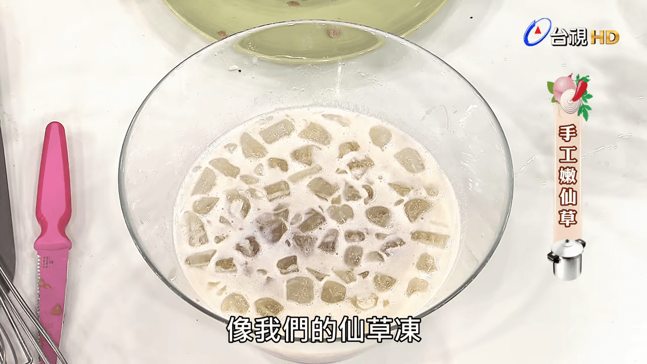9.取一大碗放入冰塊與鳳梨漿 ![ https://i.imgur.com/KgFvZ7U.png] 10.放入嫩仙草