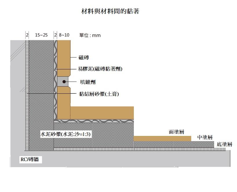 什麼是原料黏著力?就是原料與原料之間黏著力的大小,新水泥要黏結在舊水泥上,是黏不去的,因為水泥原料沒有黏力,所以中間需要有黏著層作為黏力的來源,譬如,要黏在水泥牆壁上,新的水泥砂漿本身較沒有黏力,所以需要土膏作為黏著層,再塗上水泥砂漿,這是材料與材料之間的黏著力,就需要靠中間黏著層的黏力。