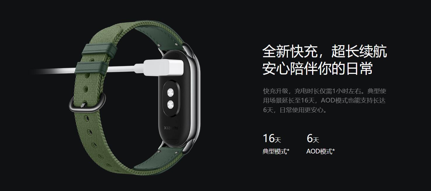 小米手環8的充電和續航也同樣讓人滿意,快充1小時充滿,滿電續航也可達16天!而且AOD(息屏顯示)模式也可達6天,而且充電的狀態和電量都可以在小米手機上即時查看喔。