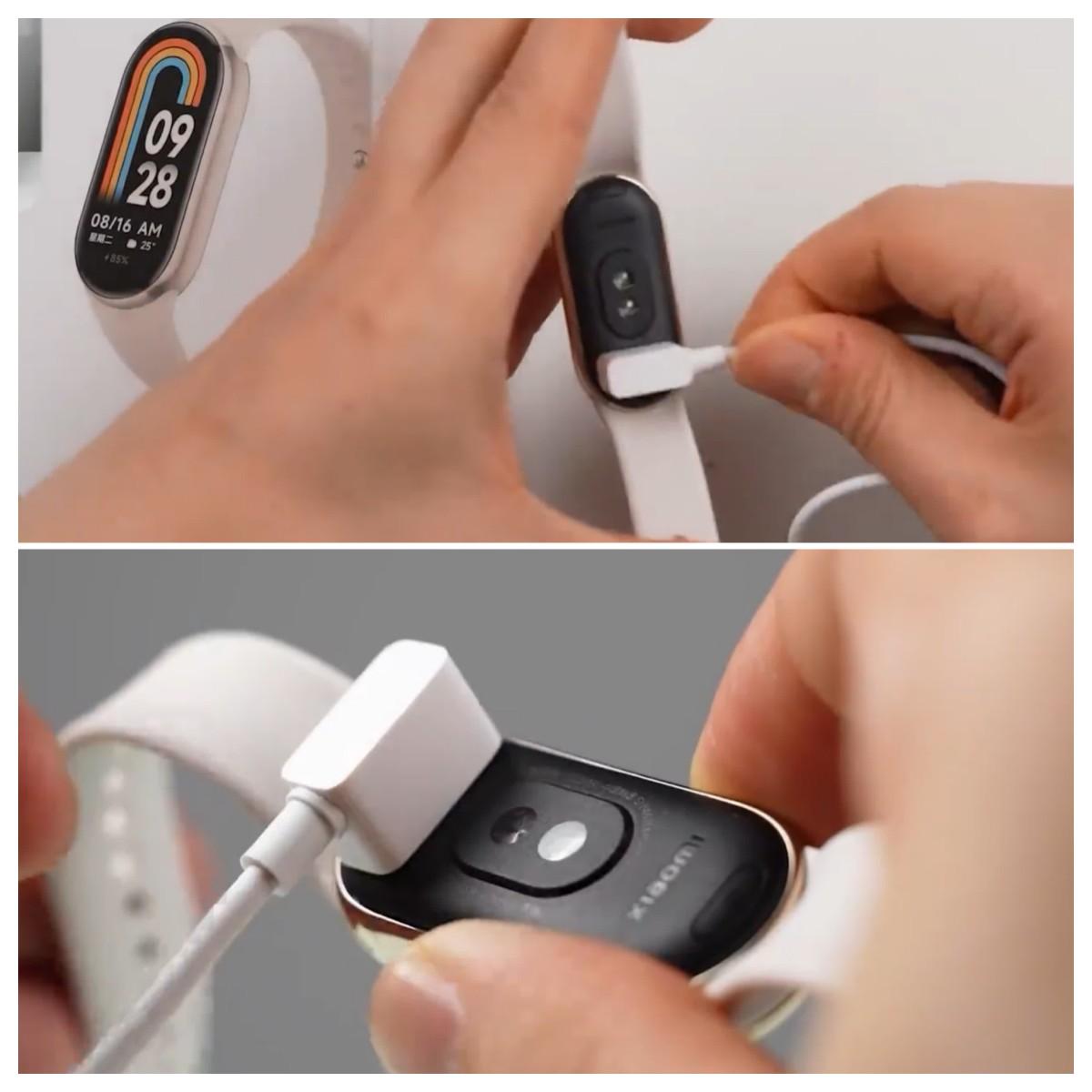 打開包裝就是小米手環8,資料線,說明書,資料線原來的黑色換成了白色。首先呢是充電方式還是磁吸式的,但是造型方面有所改變,之前是一個圓形的類似半個豌豆,這回是一個方形的,感覺更加正式。手環噴體效果呈現比較精緻,相比較於之前確實感受到有一些變化。