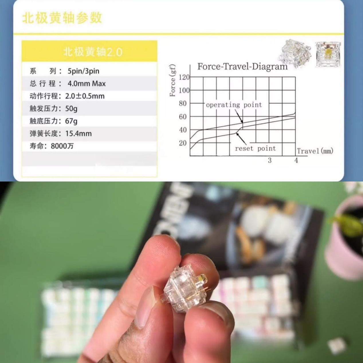 第二個等級,就是普通鍵盤玩家可能覺得那這就是加達隆的北極黃軸它的觸底壓力有67g,並且在底部有一個黃色的橡膠軟墊,所以按下時候要更用力。現在已經很少有廠家願意做67g觸底的軸體了,這些軸體主要都是銷往歐美國家,可能是歐美國家人們的手勁比較大吧,那也許他們會更加喜歡這種手感。