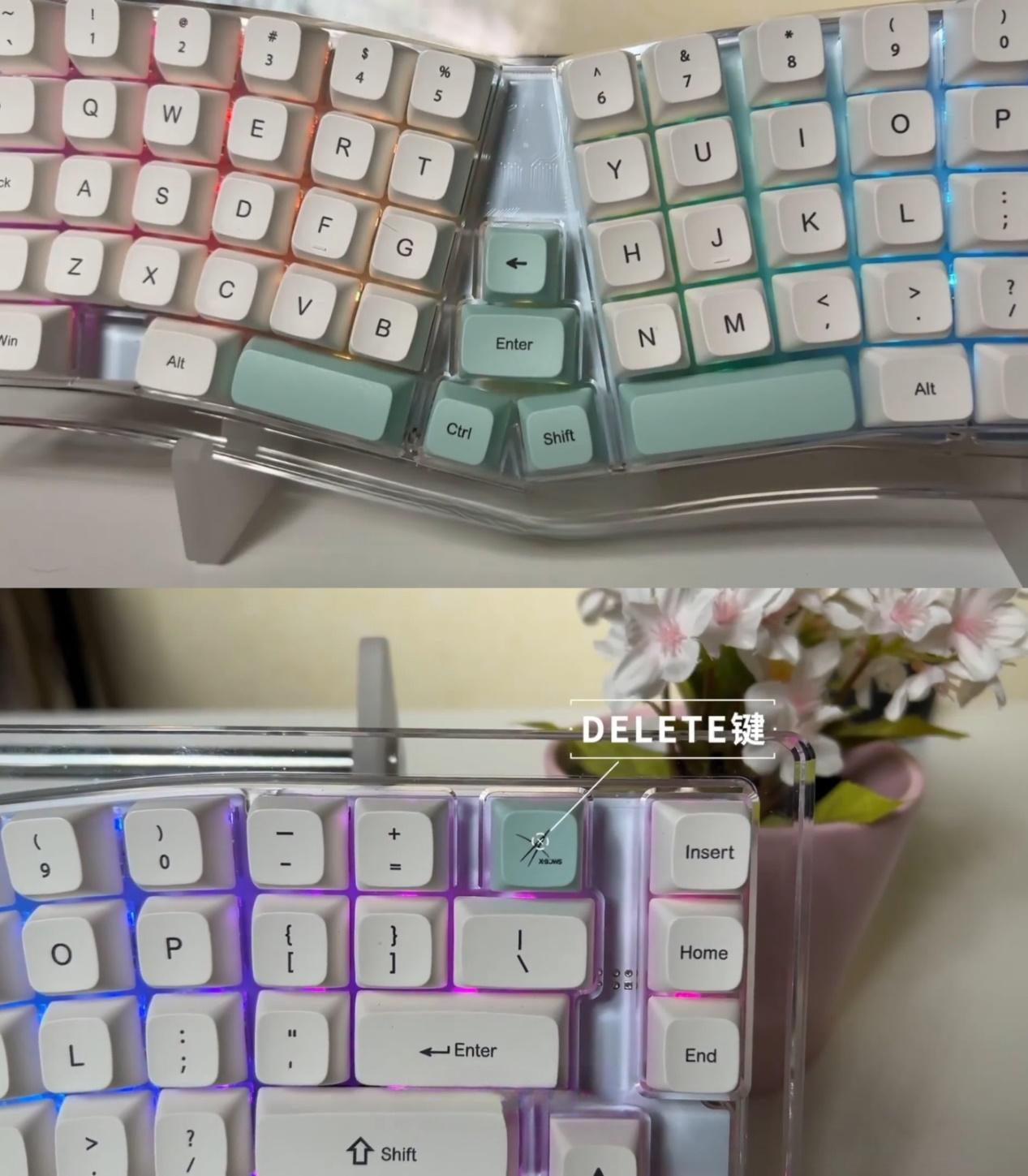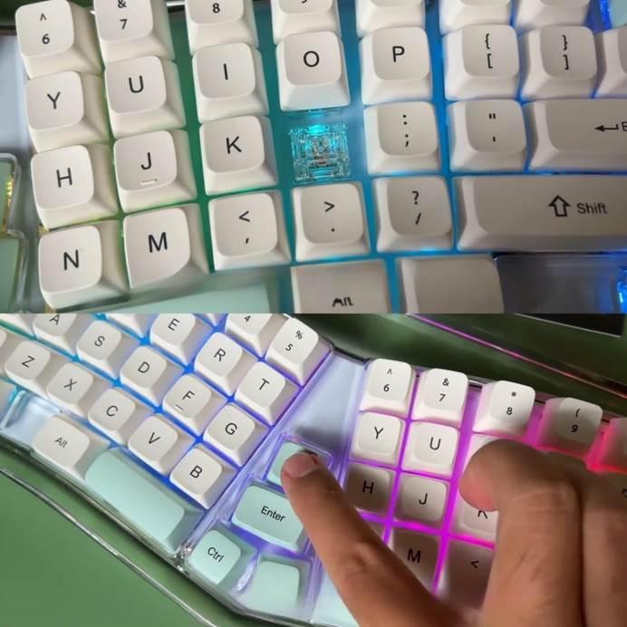 第一個有意思的改進就是這把鍵盤的配列,X-Bows水晶款之前的產品一大標誌就是在字母區的中心嵌入了四個按鍵:Backspace、Enter、Ctrl、Shift,但是又盡可能的保留了原有的按鍵。我在使用X-Bows lite的時候會本能的想要待在自己的舒適區去使用傳統的Backspace鍵,當我開始使用X-Bows水晶的時候我還是想要使用原來的Backspace鍵,但是我發現其實這個按鍵已經變成了Delete鍵,你別無選擇只能夠去適應新的按鍵。傳統鍵盤在使用Backspace鍵的時候你的手腕需要更加用力的往外翻,那一次兩次還好,對於每天要使用上百次的Backspace鍵來說會非常的傷手腕,但是經過一段時間的使用我的身體逐漸喜歡上了這個操作。X-Bows厲害地方在於這塊區域最常用的按鍵其實就是Backspace鍵,當你適應了Backspace鍵之後你會自然而然的去嘗試適應別的按鍵。