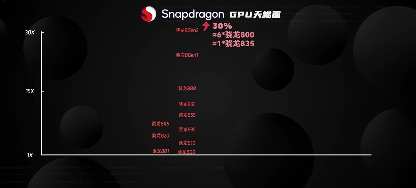 短短幾年隨著手機大型遊戲的爆火啊,這需求非常旺盛,反推到硬體技術端這GPU的提升比CPU就明顯太多了,為了你直觀的查看,我們也做了10年驍龍GPU選擇題,看這張圖其實之前都還好啊,可以直觀的看到這兩年的GPU性能提升飛速。驍龍8gen2相比驍龍8提升了30%,約6個驍龍800的性能,一個驍龍835的性能,整體來看幾乎每代提升都不算小,GPU也算是驍龍傳統優勢了,打遊戲買驍龍啊這句話呢,不算那麼坑人,不過話說回來啊,GPU的提升從技術端確實相對容易些,一是因為GPU相比于CPU來說應用場景啊較少,更像是專用晶片,設計起來呢相對較為容易注意啊也只是相對啊,第二就是隨著制程的提升,GPU有點大而不專的意思啊,只要猛堆電晶體的數量啊,就可以獲得可觀的性能提升。