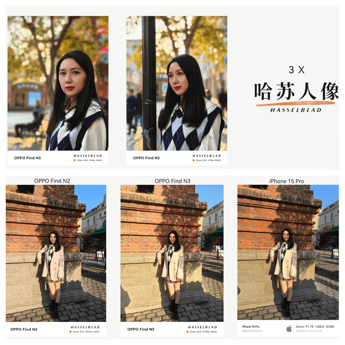 再來看一組對比樣章,在夕陽柔光的環境下,這三台機器呢,為了畫幅統一,我們先採用兩倍的人像進行拍攝。顯然友商這邊拉的距離可以更近一點,不過從牆面的部分你能看出啊,find N3的光影是更加自然,亮暗之間區分明顯,能夠清晰的看出光線的方向,整體畫面柔和氛圍感很強。放大到面部細節,上一代的N2顏色呢有一點偏粉白,而N3呢在保持自然的色彩基礎上,皮膚呢更加細膩,在光影的映襯之下也更有光澤。