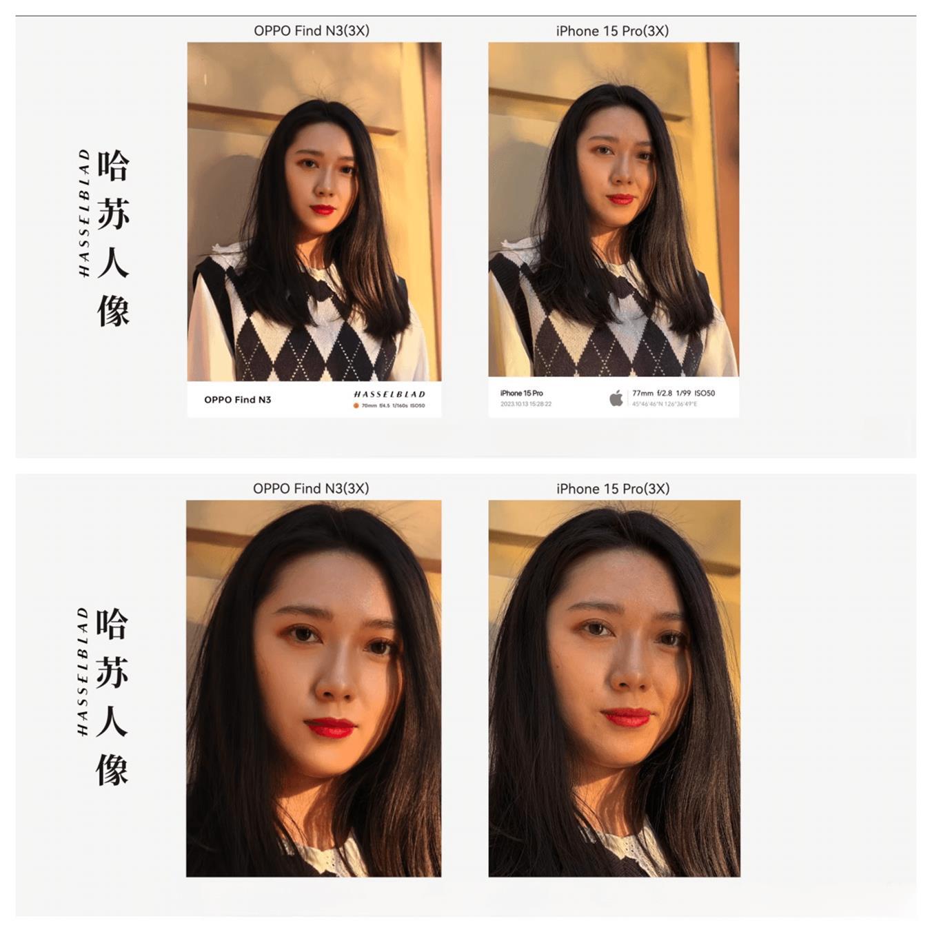 再來到室外光線充足的地方,OPPO這邊啊景深效果呢會更加明顯。放大之後呢人物和背景的分離,使得人物更具立體感。並且呢這組是人像模式啊,那顯然會有一定的美顏效果。另外就是從髮絲部分看,find N3呢相比較上一代是有明顯提升的,和友商之間則是稍微有點差距。而且呢需要說明啊作為一台折疊螢幕機型,能夠在有限的空間內可以做到與直板旗艦標杆相近的拍照水準,也可以說是一次不小的突破了。
