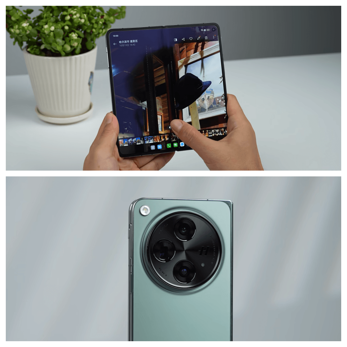 外觀部分啊,OPPO find N3帶來三款配色,這裡給你展示的是千山綠。第一觀感你覺得如何呢?我自己的感覺就是十分的硬朗幹練。前後呢均為平直設計,這和上代相比啊,你能看到非常明顯的差別。背面呢是冷雕玻璃工藝和高亮的金屬邊框搭配在一起啊,質感還是非常強烈的。鏡頭部分呢同樣很吸睛,圓形的鏡頭模組也是保持了和自家Find X系列一樣的設計語言。