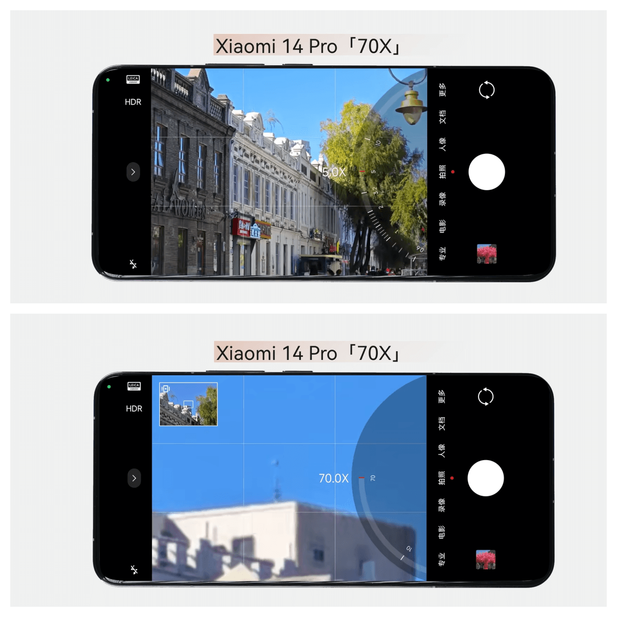 超廣角方面呢,採用的是5000萬圖元14mm超廣角f 2.2的光圈。小米14 Pro版本相對於標準版的區別主要在於,主攝是支援1024級別無級可變光圈,可以在f 1.4到F 4.0的範圍內自由調節光圈值,還有呢就是超廣角鏡頭Pro版本呢還支持最近5cm的超級微距模式。另外呢75mm這顆浮動長焦鏡頭啊最大是支援到70倍的數字變焦。