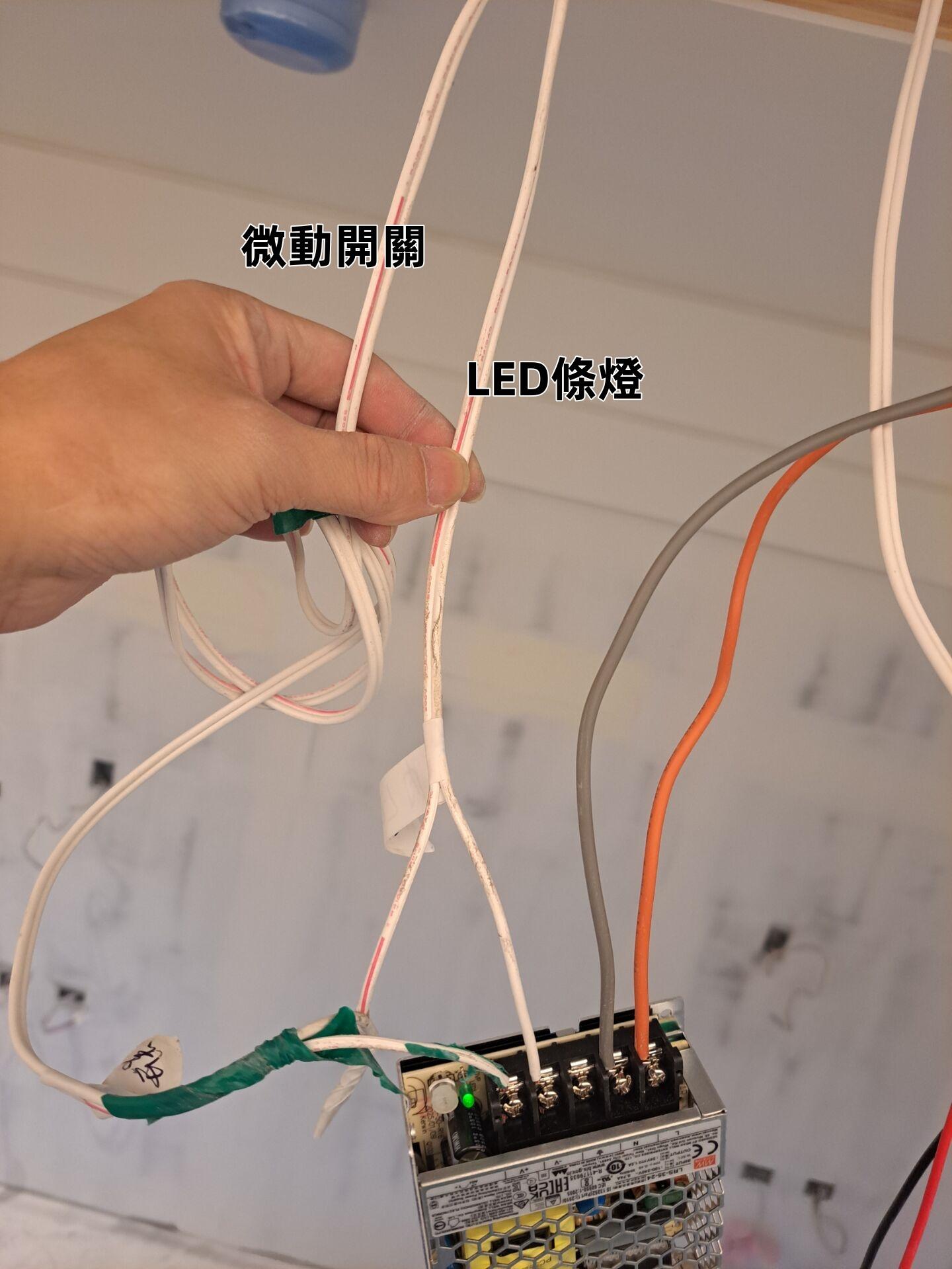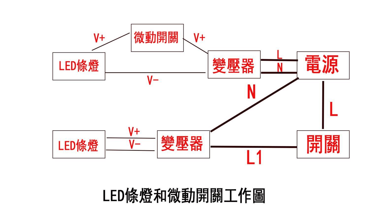 在變壓器接線出我們可以看到L、N和微動開關的兩條線、LED條燈的兩條線。L和N是接電源,V-我們需要接條燈的V-,V+接微動開關的其中一條,然後條燈的V+接微動開關的另一條線。這裡其實新手會容易搞不明白,但是記住控制原理就可以了,衹是這裡經過了變壓器而已。