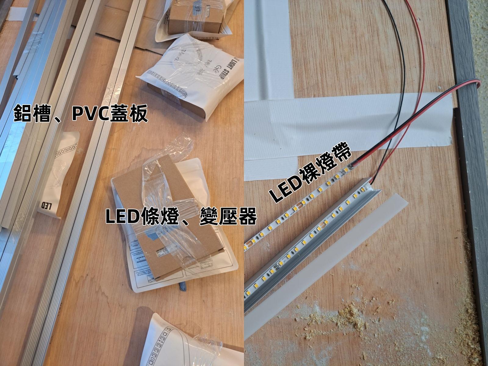 這是櫃外條燈的安裝,LED條燈搭配鋁條使用,並使用手動按壓開關控制,需要注意的是如果不是裸燈帶安裝,則需要在鋁條背面打矽利康固定,不然時間久了鋁條會掉下來。裸燈帶安裝,只需要背膠粘住即可。