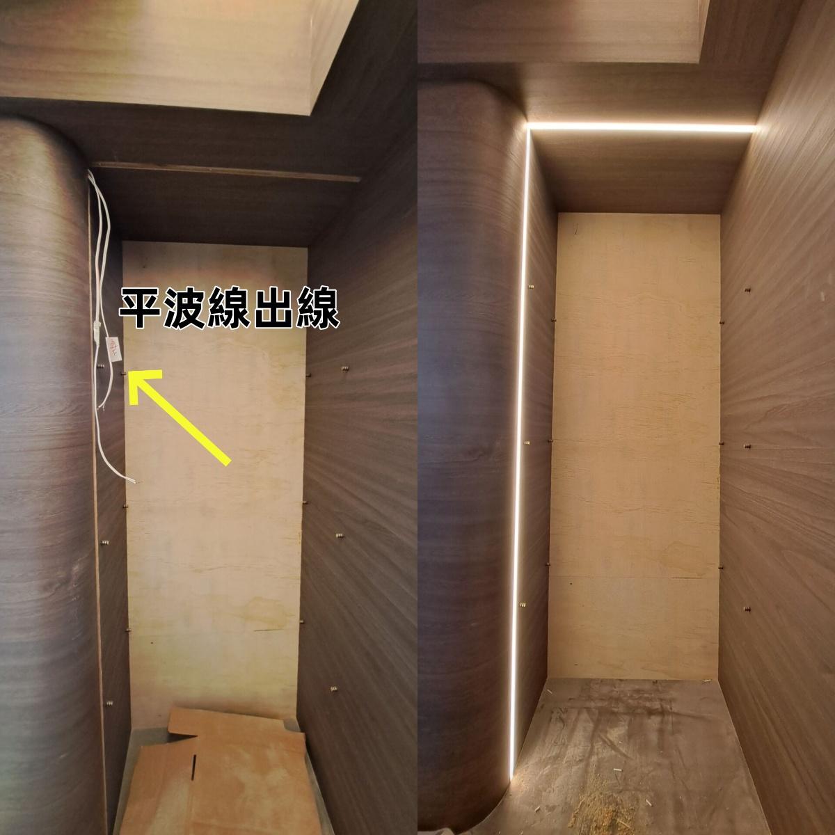 所以櫃內條燈配線我們需要从電源拉L、N兩條線給變壓器供電,然後在从變壓器位置用平波線配2組線到櫃內,一組是LED條燈電源,另一組是給微動開關用。而櫃外條燈配線是从開關拉出控制線L1和電源端拉出N相共兩條線到變壓器,然後再從變壓器位置配線到條燈位置。需要注意的是LED條燈安裝是在最後的收尾階段,所以變壓器位置要放在以後收尾可以拿的到的位置才可以,一般是維修孔、空調出風口、大點的嵌燈燈孔位置。