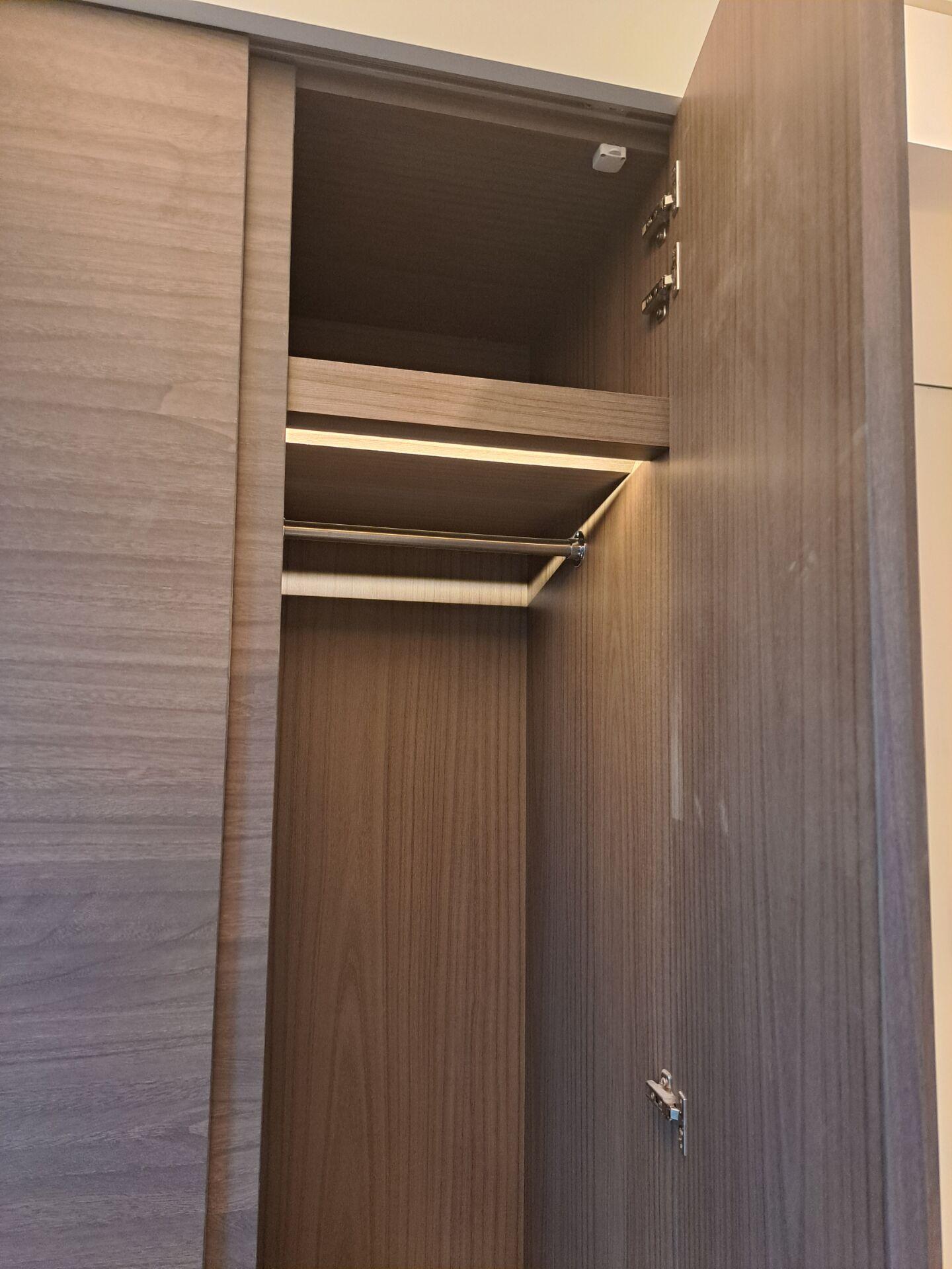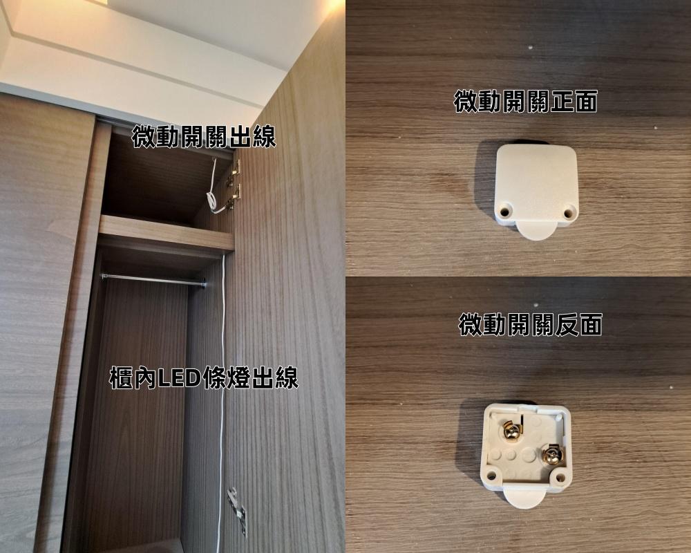 對於櫃內條燈需要安裝微動開關和LED挑燈,上面的是間接照明,所以只需要安裝裸燈帶即可,比較簡單。需要注意的是微動開關的安裝与接線。微動開關有一個可以按壓的按鈕,當我們關上櫃門時按鈕會被按壓進去,打開櫃門是按鈕在自動彈出,微動開關就是通過這種方式來控制電源的通斷,從而控制條燈的開關。