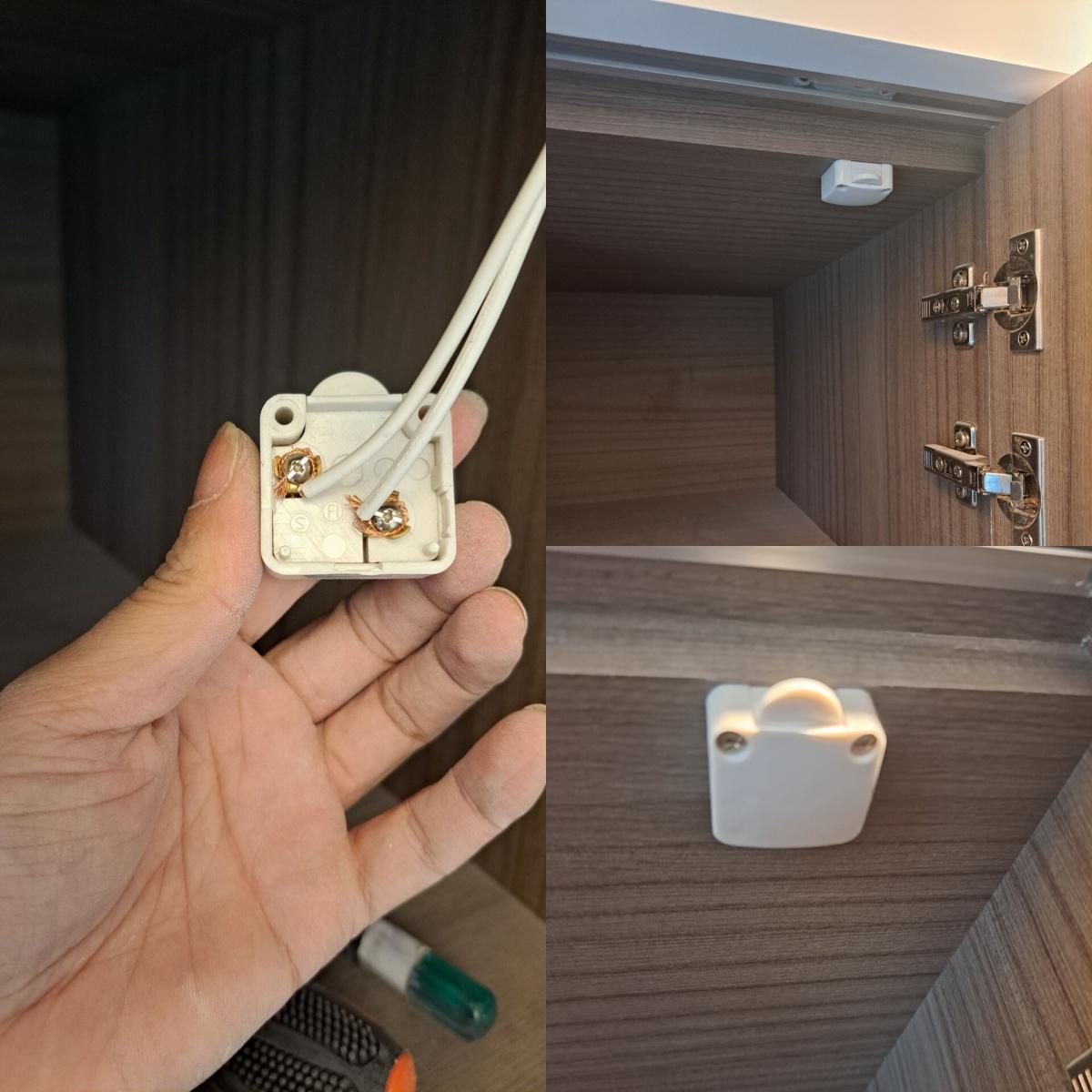 首先把平波線接線到微動開關的兩個點、然後把微動開關锁在櫃板上,需要注意的是最好不要讓微動開關突出櫃板,這樣會導致櫃門無法完全關閉;也不要縮進去太多,不然關閉櫃門后微動開關按鈕無法被櫃門按壓回去或者按壓幅度不夠,打不到開關燈的目的。